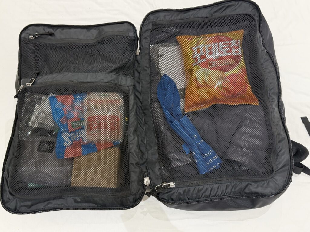 特に海外旅行では「一度で全体を把握できる」ことがストレス軽減につながります。 この点は、一般的なトップローディング型バックパックとは明確な差を感じました。